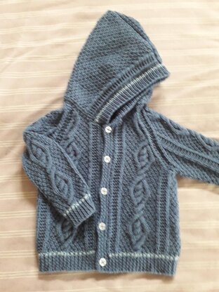 Toddler hoodie, age 2-18 months, chest 24", suitable for boy or girl. Knitted in one piece to armholes in a combination of cables, garter stitch panels and double moss stitch