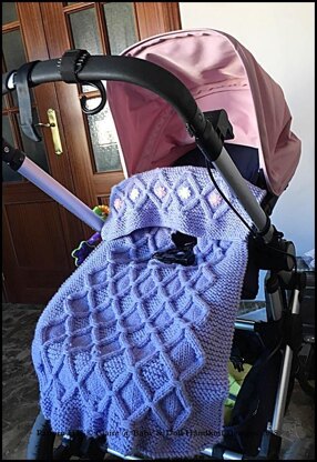 Knitting pattern for three blankets. One to fit a car seat, one to fit a pushchair, and a pram blanket. The car seat and pushchair blanket have openings that the straps fit through to hold the blanket securely in place. The car seat blanket is knitted in aran (worsted) weight yarn and the other two in chunky.