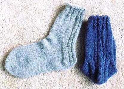 About The Design: The design features of these socks are at the rear of leg and heel flap, for the express purpose of being seen in clogs! I’ve worked them in a couple of Naturally DK wt. yarns, from New Zealand, to fit a medium size woman’s foot. The alpaca blend yarn is especially yummy! The pattern is in written and charted form. The subtle slipped cable pattern circles the cuff, but then drops down to a single cable at the center rear of leg, and then increases to 3 cables, then 5 cables at heel flap.Yarn Used: Naturally Guernsey 8-ply (DK wt.) NZ wool, 240 yds / 100 gram skeins: 2 skeins Storm #111OR Naturally Aspring 8-ply, 60% NZ wool / 40% Alpaca, 222 yds / 100 gram skeins: 2 skeins Grey #601OR Naturally Luxury DK, 50% wool / 50% mohair, 113 yds / 50 gram skeins: 3 skeins