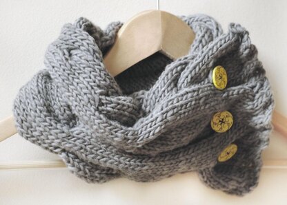 This cowl is a very quick knit, only taking 3-4 hours, it is perfect for beginners wanting to tackle their first cables or for the more experienced knitter who is after an instant gratification knit or a quick gift. It knits up to a soft snuggly cowl highlighted with some statement buttons.
