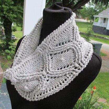 This Pattern is worked in joined rounds to start, and then flows into a spiral, quite naturally. As one diamond grows, the other comes to it’s peak. The cable bands divide the cowl into sections, -offering texture and visual appeal.