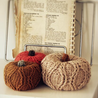 Add a beautiful touch of handmade to your autumn decor with these adorable cabled crochet pumpkins. Pattern includes 2 sizes - small (approx. 4" wide), medium (approx. 6" wide).
