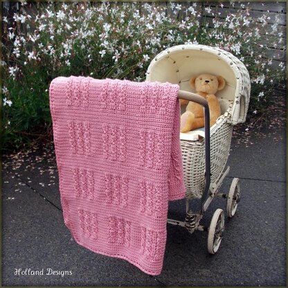 This beautiful cabled blanket may be made to any length and width. Sample blanket measures approx. 31" x 33" including edging. Worked in one single piece - no seaming required.