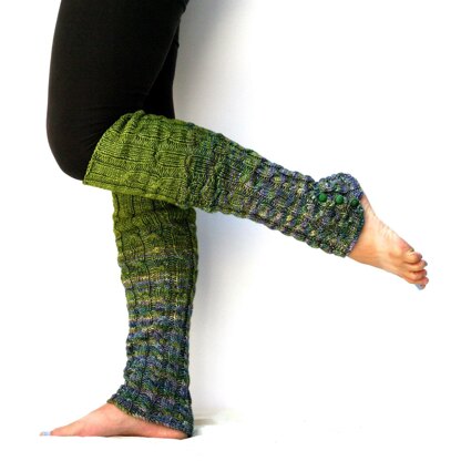 Beautiful cables and blended ombre color make up these practical leg warmers. Thoughtful details make up the design: buttons at the cuffs to allow the warmers to fit over shoes and boots, color blending built into the pattern. There are also no increase stitches, as the cables strategically unfold through the pattern to allow the warmers to grow at the top. These are a fun and relatively easy knitting project, and the finished product will keep your legs warm all winter long in style. One size fits many. Finished measurements, when laid flat: 19” in total length, measured from top to bottom hem, stretchy 9” circumference at bottom edge when buttoned, un-stretched 11” circumference at top edge, un-stretched