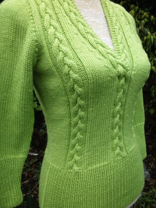 A beautifully shaped sweater with a vintage air - designed to flatter! Stitches used are stocking stitch, single rib and plaited cables. A tiny garter stitch edge frames the cable neckline. The border around the neck is worked in one with the front, and the neck decreasing is worked away from the cables so that they don’t interfere with the cables. This design has 3/4 length sleeves.