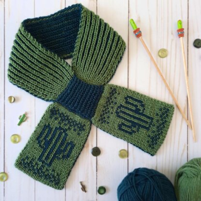 Knit in one piece, the scarf begins with a Double Knit Cactus, continuing into a clever Keyhole design.