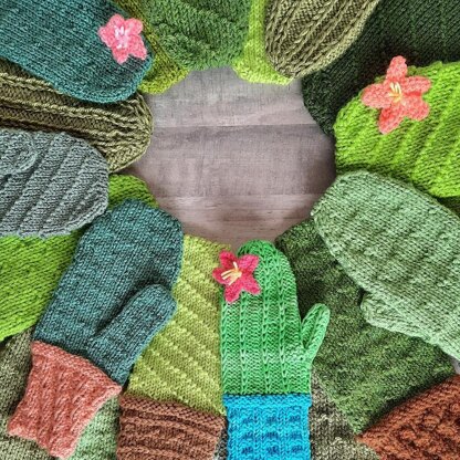 Choose from 3 Planters (Cuffs) and 3 Cactus Mittens, featuring textured stitches without cables.