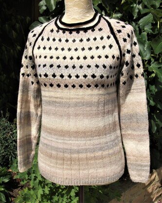 Simple wide rib forms the main part of this sweater, giving a flattering, neat fit. The emphasis however, is the 2 shade colourwork yoke which ties in with the up-to-date block colour. The edges of the sleeves look great with their contrast edgings.