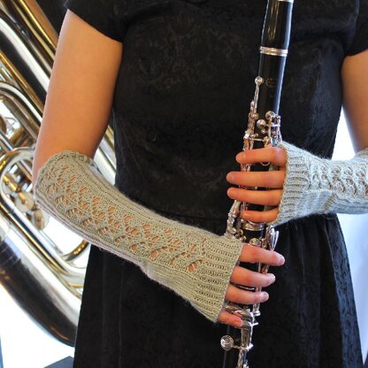 Cadenza, an ornamental passage in music, is like a great accessory to a concerto. These fingerless mitts are a great accessory to add just the right notes to any outfit. They are long and feminine, reminiscent of times past and delicate, but not overly so. Stretchy twisted ribbing makes them fit most everyone.