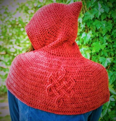 A modern interpretation of Cadha’s Capelet worked in one continuous piece from the point of the hood down to the bottom edge. Inspired by the Celtic Knotwork of Ailee’s homeland, the Eternal Knot cable pattern on the back has no beginning or end, connecting one's destiny bound by time and change. The pattern comes with three variations: a hood, an easy version without the cable, or a collar rather than a hood.