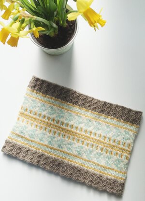 The Cadwyn Cowl is a cosy short cowl made up of a mixture of two and three colour stranded colourwork and a border of twisted cable ribbing at each end. The design is inspired by traditional geometric fair isle patterns and the natural colours of early spring. Cadwyn means “bright chain”, referencing the way that the different colourwork patterns move across the cowl. The cowl is knit entirely in the round and uses 4 colours of DK weight yarn making this an excellent project to use up scraps.