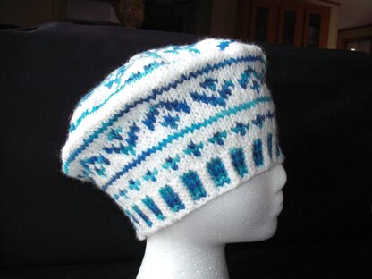 This is a tam shaped knit hat pattern. It incorporates some aspects of fair isle knitting and is a stranded knitting hat pattern.