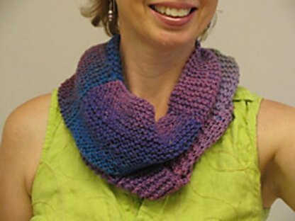 Here's an easy garter stitch cowl that highlights self-striping yarn with its multi-directional design. Even scraps of multiple colors will achieve a unique project. Can be left in scarf form, or seamed at the end for a cowl, as pictured. Easy enough for beginners.