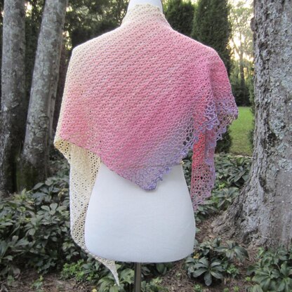 Caila is an asymmetric triangle which begins with a tiny number of stitches and gradually increases in length and width. Clusters worked sideways instead of up and down create interest to the piece. The wide, lacy edge compliments the main body and is worked at the end as a visual flourish.