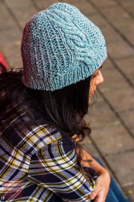 This snug hat has a ribbed brim and is worked from the bottom up. The alternating cable and mesh panels make it a quick and fun knit.