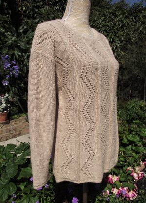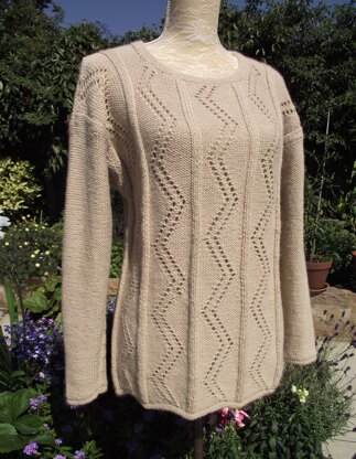 An attractive, yet cosy, tunic sweater for cooler days. The beautiful eyelet zig-zag panels looks super interspersed with the rib verticals, which really stand out and are so flattering. There is a little additional side shaping on the body, ensuring a relaxed fit. Sleeves are in reverse stocking stitch with semi dolman sleeve shaping. All borders are finished with natural roll-over edges - no stitching to do!