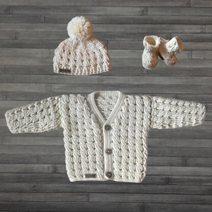 Caleb cabled cardigan, hat and booties crochet pattern set for 0–3 months to 2 years worked seamlessly for everyday wear, baby gifts and special occasions. A matching handmade set for baby boys and girls.
