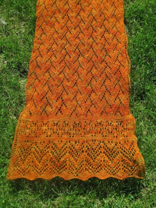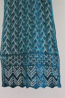 The Call of the Sirens lace stole draws on the Greek myths about the Sirens. The Sirens’ calls could bewitch sailors to make them forget who they were and and where they were going. Often the Sirens caused them to forget to navigate their ships and the ships would be wrecked against the rocky shore. The edging of the stole show the waves, followed by the rocky shoreline. The center portion of the stole represents the braided hair of the beautiful Sirens.