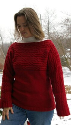 This cozy sweater is a great knit for the depths of winter. Its generous sleeves are knit cuff to cuff in a cabled rib pattern that drapes nicely over the shoulders and across the fingers. The wide boat neck slides easily over the head and sits without binding. The body is roomy and has enough length to make you want to just curl up in it – with a book or a loved one. Cabling without a cable needle was never so fast and easy – or with such flattering results!