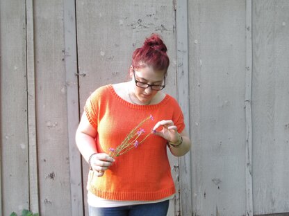 The Cam Tee is a loose, breezy top for warm summer days and cool summer nights. Constructed from the bottom up, the top features a split hem, cables running up each front side, twisted ribbing up the back sides and on every finished edge, and a wide neckline.