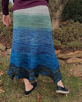 Yarn: Dragonfly Fibers Dragon Sock, 390 yards/114 g, 6 skeins. Your yardage will vary based on your measurements! Sample knit in Birch, Titania, Denali, West With The Night, Captain Nemo, and Rocky Top. Sample uses the least of the colorway at the waist, gradually increasing as you near the hem.