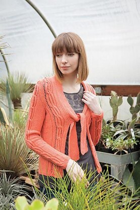 The front edgings cleverly form a sash that ties in the front and each edging is flanked by a pretty openwork cable. The cable is repeated on the sleeves for a charming accent, and also appears on the back. The rest of the body is in stockinette stitch.