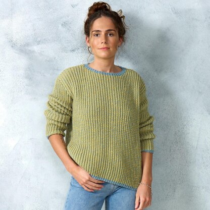 Camille is a long sleeved, round neck sweater knitted in a striped fisherman’s rib pattern.
