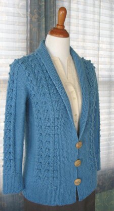 Businesslike, yet casual, this cardigan is constructed partly modularily, beginning with the bottom “rib” worked side to side in garter stitch. Stitches for the body are picked up along one edge of the band. Shoulders are shaped using short-rows, then joined using Three-Needle Bind-Off. A wide garter stitch collar is added along the front and back neck edges, adding short-rows at the back neck for a fold-back shawl collar. The sleeves begin by working back and forth, adding a faux placket, then joining to work in the round to the underarm length. A cable and bobble panel is also worked up the center of each sleeve. Crochet button loops are added at the lower front.