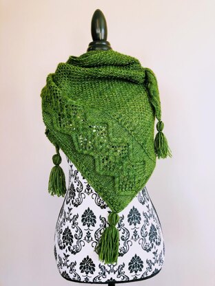 This is an asymmetric triangle shawl, that has a beautiful cable design edge border and a fun textured body. The main body is an easy 4 row repeat that is worked with knit stitch only, no purling in the main body section. The border is a beautiful cable design framed by a simple I-cord edge.
