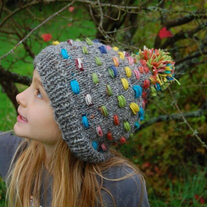 The DK Knitcol contrast yarn I chose has short colour repeats (think self-striping sock yarn) so that the “buttons” change colour a couple of times a row. There are many delicious colourways of this yarn to match any background colour, some of which would be ideal for a boy version with camouflage colours or more masculine tones.