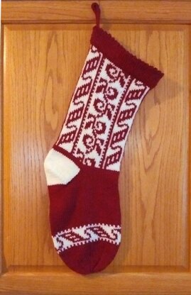 Worked in two-color stranding, this stocking is knit top down, with a picot hem, contrast flap-heel and a star toe. The ribbons are repeated across the toe just before the shaping.