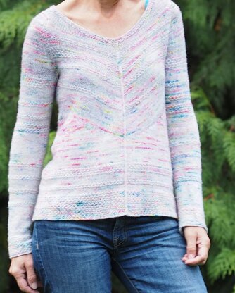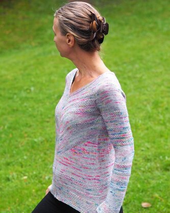 Top down seamless raglan sweater with some texture stitches accents and slightly A-shape form. It has two versions for the sleeve - short and long.