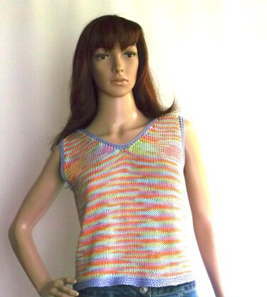 This pretty vest top is worked in two pieces (front and back are the same) then sewn at the shoulder strap seams. Stitches are then picked up around the neckline and the armholes, for a skinny garter edge. Stitches are then picked up along the side seams and a three needle bind off is worked to join them.