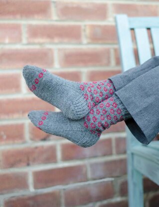 Worked from the cuff down with a simple colorwork pattern through the sock’s leg and a band of colorwork around the toe.