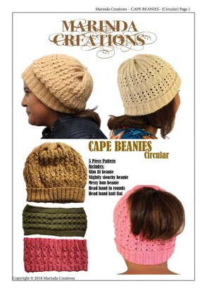 Another of my own designs .DESIGNERS NOTES: I called it Cape Beanies after my long stay in Cape Town . The winter was extremely cold so I decided to design and knit some beanies for myself . The beanies are both knit in rounds . The 1st one is a slim fit and the 2nd one is slightly slouchy . I also include knitting instructions for a Messy Bun Beanie and a Head band ( circular and knit flat ) The pattern is a cable like stitch , with a 6 row repeat .