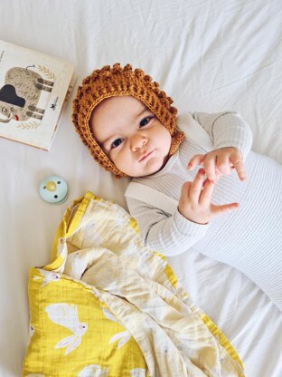 This bonnet style hat is simply adorable. It is a warm accessory, simple to make, and with a vintage touch that brings a lot of style to the little ones. It is constructed in a single piece, from a rectangle that combines plain rows of single crochet and others with popcorn stitch.
