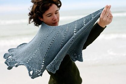 Following the gentle curve of a wave this wrap has a delicate scalloped lace edging. Worked from side to side short row shaping forms a gentle curve and tapers to a tail making it wonderful for staying in place over your shoulder. Worked in one piece, the edging is worked with the piece so there are no stitches to pick up when you are finished.