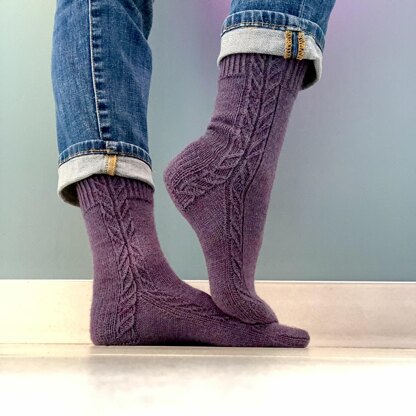 Techniques: Knitting in the round, increases/decreases, twisted stitches, basic cuff down sock construction, heel flap, picking up stitches.