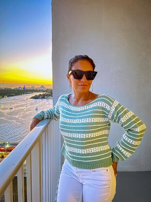 The Cardiff Coast Sweater is a size-inclusive knitting pattern for a beautiful striped sweater with floral lace stitch and textured contrasting garter stripes. Feeling light as air and soft as a whisper on your skin, the Cardiff Coast Sweater is a simple knit for an adventurous beginner.