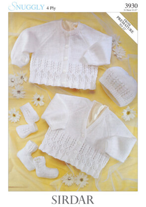 Cardigan, Hat, Mittens and Bootees in Sirdar Snuggly 4 Ply 50g - 3930 - Downloadable PDF is a Intermediate Knitting pattern by Sirdar, available as a Downloadable PDF and includes instructions in English. Super fun to make, this pattern could be your next masterpiece!