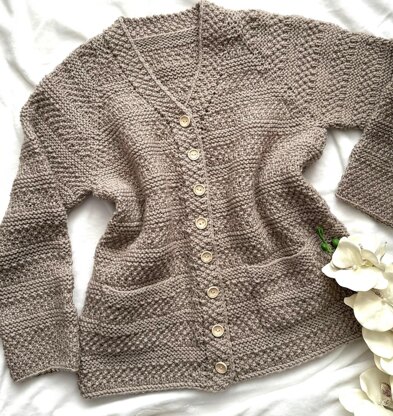 GARMENT CONSTRUCTION: This gorgeous Cardigan is worked in one piece, knitted seamless from the top down. Body is worked flat, and Sleeves are later picked up and worked in the round. Two options are given for the buttonband and cuff pattern.