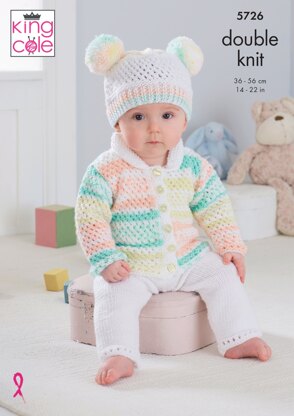 Cardigan, Trousers, Hat, Onsie and Blanket Knitted in King Cole Double Knit - 5726 - Downloadable PDF is a Intermediate Knitting pattern by King Cole, available as a Downloadable PDF and includes instructions in English. Super fun to make, this pattern could be your next masterpiece!