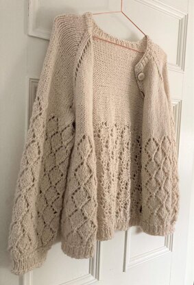 GARMENT CONSTRUCTION: The cardigan is worked from the top down, yoke is worked first then body and sleeves are separated, and body is finished. Sleeves are worked in the round without decreases to create wide bell sleeves.