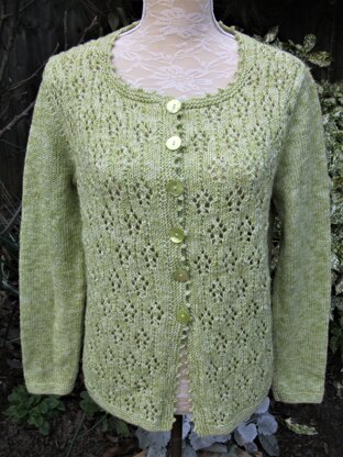 This pretty cardigan combines lace elements with alternating eyelet medallions on the fronts - the back is in stocking stitch, as are the sleeves. The garter stitch edges of the borders are finished with an easy picot row around the neck and front borders. The neckline is set slightly away from the neck allowing you to wear a pretty choker necklace if you wish.