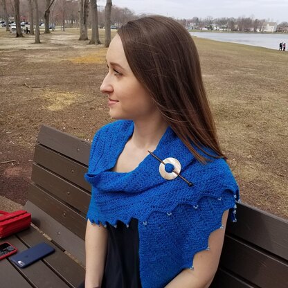 A Tunisian shawl worked side to side with a beaded edge. Made with fingering weight yarn.
