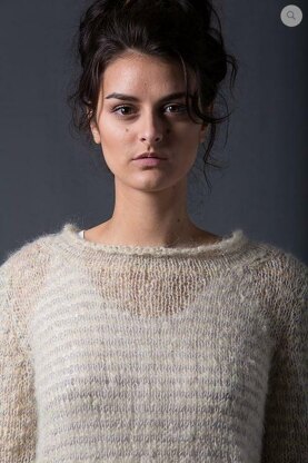 A comfortable casual featherlight loose knit mohair, wool & silk sweater with shaped sleeve tops and Stocking stitch neckband. Two colour options are given.