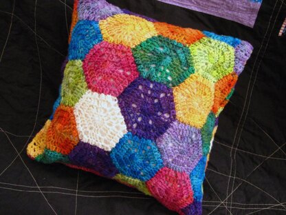 Brighten up your home with this easy crocheted hexagon motif pillow with a striped envelope closure on the back. This pillow cover is an excellent use of leftover sock yarn and fits a 14 inch pillow form. The pattern contains written instructions and uses US terminology. Do you have lots of leftovers? You can keep making motifs and expand the pattern to create an afghan.