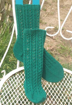 You can have a Carnivale any day of the year with these socks on your feet. This top-down sock pattern combines simple slipped stitch zig-zag cables, coins, and beads to capture the feel of Mardi Gras. While any sock yarn will work, solid or semi-solid yarns in Mardi Gras colors (green, purple, or gold) are suggested. Carnivale has directions for 4 adult women’s sock sizes, extra small, small, medium and large, equivalent to women’s shoe sizes US 6-6.5 (EU 36-37), US size 7-7.5 (EU 37.5-38), US 8-8.5 (EU 38.5-39) and US size 9-9.5 (EU 40-41). Directions include a fitted heel and simple arch shaping.