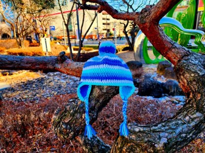 and finishes with earflaps, braids with tassels and as embellishment a big pom pom.