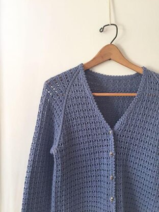 V-neck cardigan is worked seamlessly from the top down using raglan shaping. Lower edge, cuffs, button and buttonhole bands are hemmed with a serrated edge that incorporates after-thought buttonholes.